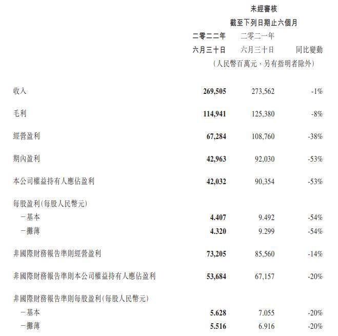 2022年上半年总收入为人民币2,695亿元,同比下降1%。上半年净利润420亿元人民币,同比下滑53%。