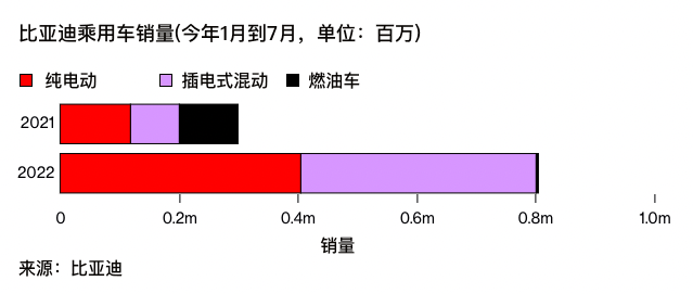 从很多方面来看,王传福的策略已经取得了成效。比亚迪现在是世界市值第三高的汽车制造商,市值约为1万亿港元(约合8600亿元),仅次于特斯拉和丰田。虽然比亚迪有销售内燃机车的传统业务,但该公司在4月份表示,已停止生产燃油车。今年截至7月,比亚迪共销售了80万辆新能源乘用车,超过了2021年全年的销量。“比亚迪致力于以更安全、更可靠的新能源技术和产品满足更多细分市场的需求,以加快新能源汽车的普及,”该公司发言人在一封电子邮件中回应称。