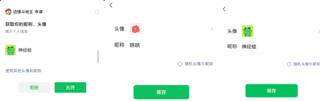 当登入第三方APP时,APP会获取你的头像和昵称,这时候选择“新建头像和昵称”,可以随机获得一个头像和昵称,大概率是“神经蛙、阿白、哄哄”,使用“虚拟身份”登入就好了。