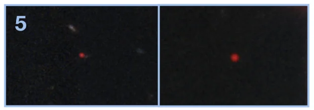 不过,所填充的颜色依然保有物理学上的意义。这两个“朱砂点”是很多天文学家朝思暮想的目标:鲜艳的大红色意味着它们的辐射全部集中在波长最长的红外波段,恰是宇宙极早期星系的典型观测特征。