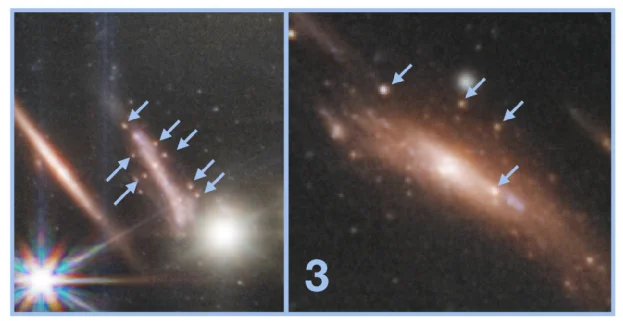图3的区域很小,但是如果放大了看,能看到星系周围散落着一些珍珠般的小亮点。这些珍珠其实是在宇宙更早期的星系中诞生的一系列年轻的星团。