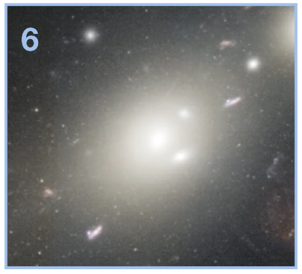 现在,让我们再一起看一下这张照片的中心。图6是整张图片里最显眼的星系:端坐在星系团中央的椭圆星系。它们是宇宙中质量最大的罕见星系,可达到一万亿倍太阳质量。