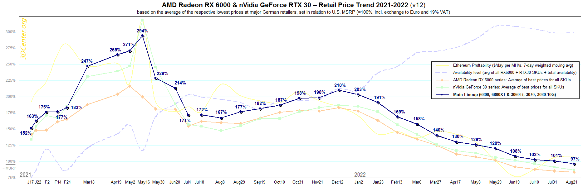 根据3DCenter对德国、奥地利市场的统计,截止当地时间8月21日,RTX 3080 10GB、RTX 3070、RTX 3060 Ti、RX 6800 XT、RX 6800这五款诞生于2020年的高端显卡,平均售价已经降至发行价的97%,总算是“破发”了。