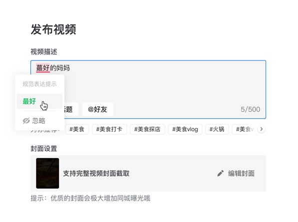 据悉,此次上线的“发文助手”功能将会对用户发布内容中的错别字、错误语法、不规范用词等进行检测和提示,使用场景包括标题文字、画面自定义文字、评论文本等。