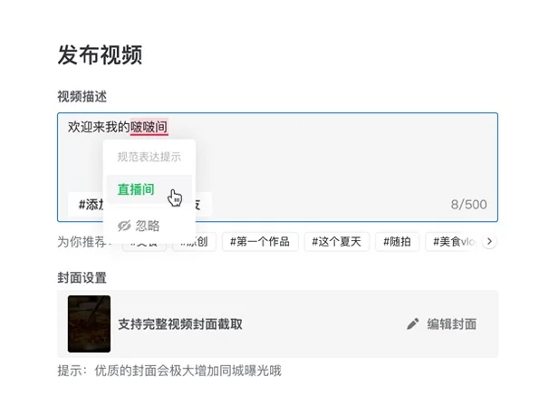 具体而言,当用户在抖音编辑文字,准备结合音视频发布时,模型会对用户输入的文字进行自动排查,一旦分析到输入的内容可能存在不规范表达,则以红色下划线形式进行提醒。当用户将指示箭头移至该处,系统会自动在该词下方提示可能正确、规范的文字。比如当用户输入“啵啵间”则会在下方以绿色文字提示“直播间”、输入“蕞好”则会提示“最好”。如果系统分析有误,用户只需把指示箭头移至文字“忽略”处并点击,即不再出现提醒符号。