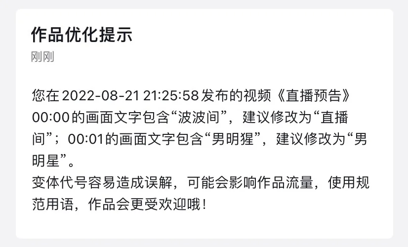 除发布前提示,用户内容发布后,系统还将针对视频进行整体检测。如发现视频中存在不规范表达,将以“作品优化提示”告知用户具体某一时段存在不规范之处及修改建议,比如“00:01的画面文字包含‘男明猩’,建议修改为‘男明星’”。