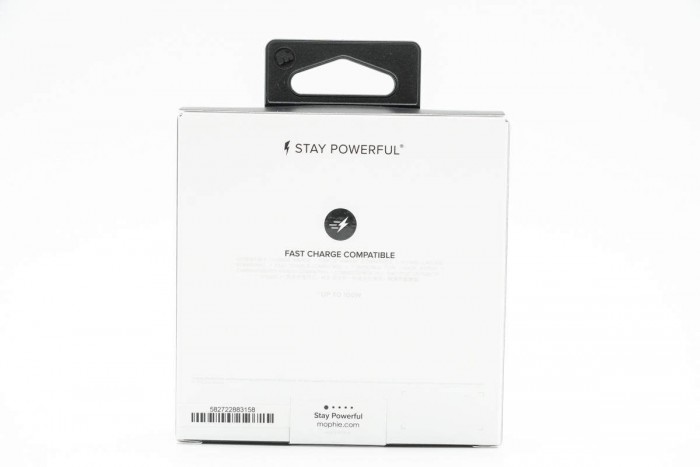 线材采用白色纸盒包装,正面印有线材外观图;除顶部 mophie 品牌Logo外,最显眼的就是线材本身的编织线工艺图示;其次为底部的“USB-C cable with USB-C connector 100W”规格字样。