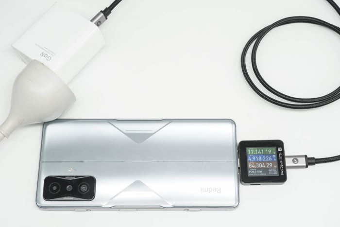 使用小米120W氮化镓充电器搭配线材为红米K50电竞版充电,此时的功率在84W左右,电流达到了4.91A,实测线材可以传输5A大电流。