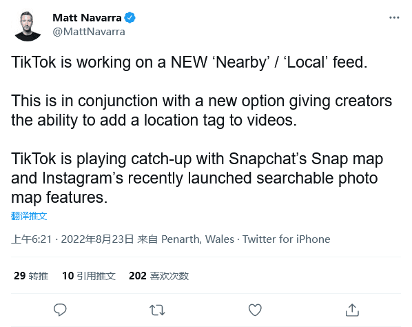 据报道,目前正在测试的新功能,允许创作者为他们的视频添加位置标签。TikTok发言人表示,添加位置标签的功能正在逐步向创作者推广。当被问及“附近”功能是否只显示有位置标签的视频时,发言人说,由于目前功能有限,现在下定论还为时过早。