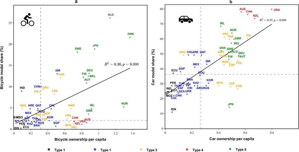 总体而言,研究人员将国家分为五类。其中一类包括汽车或自行车很少的低 GDP 国家。另一个类别,包括中国、智利和巴西,包括快速增长但从低水平开始的汽车保有量和增长缓慢或根本没有增长的自行车保有量。类似的类别包括相同的模式,但从两种类型车辆的更高所有权开始。这包括意大利、波兰和葡萄牙等地。
