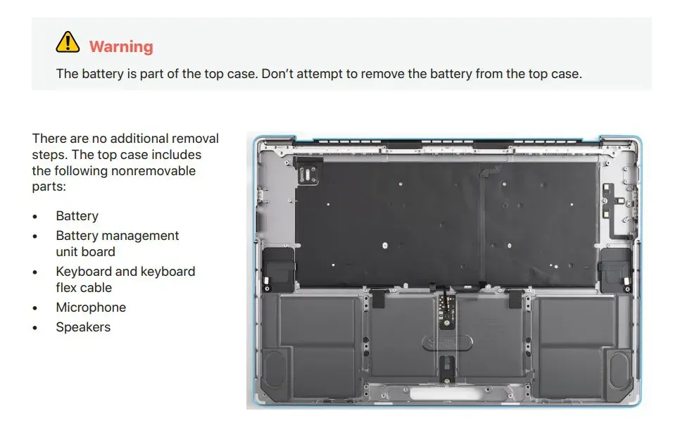 从苹果官方的定价来看,提供了大量的零件供用户更换。但实际上还是有几点需要注意的,那就是列表中并未提供电池和键盘更换。您必须购买随附的整个顶盖以及预先安装的其他部件,而且您的电池更换费用是 Apple 收取的 199 美元的两倍多。苹果没有立即回应置评请求。
