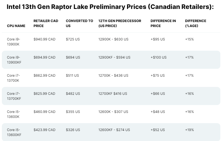 Intel将在9月底发布13代酷睿Raptor Lake处理器,不过,有加拿大经销商提前把部分型号摆上架。规格这块争议不大,而让人不淡定的情况在于,价格出现普涨。比如酷睿i9-13900K为941加元、酷睿i7-13700K为553加元,酷睿i5-13600K为427加元。对比同一家店售卖的12代酷睿,价格涨幅在15~19%。