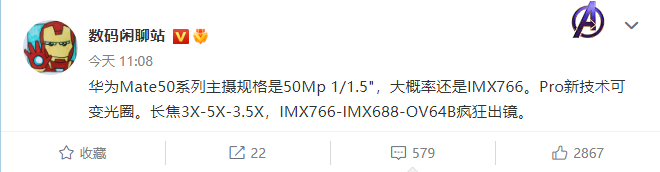今天中午,爆料博主数码闲聊站终于带来了一些详细消息,称Mate 50系列的主摄规格是5000万像素镜头,1/1.5"大底。