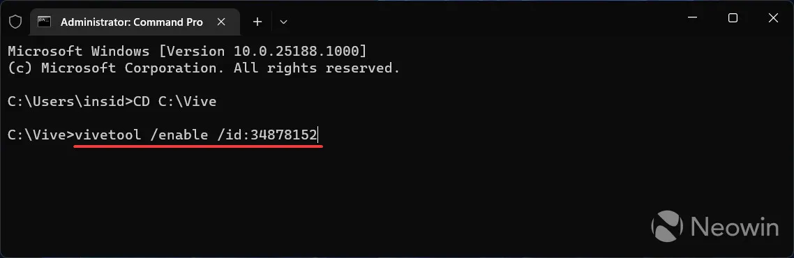 4. 输入以下命令:vivetool /enable /id:34878152 然后敲下回车