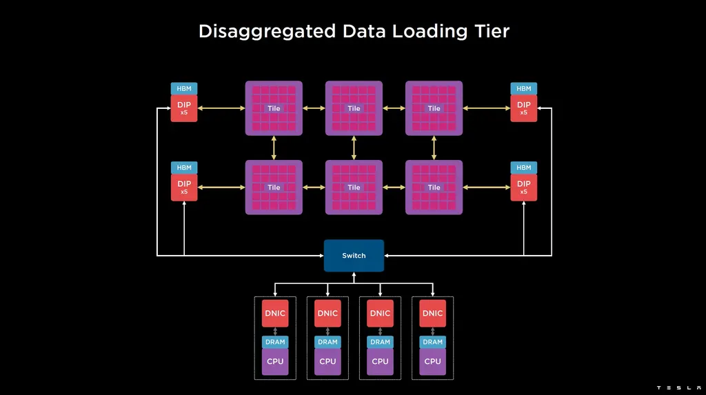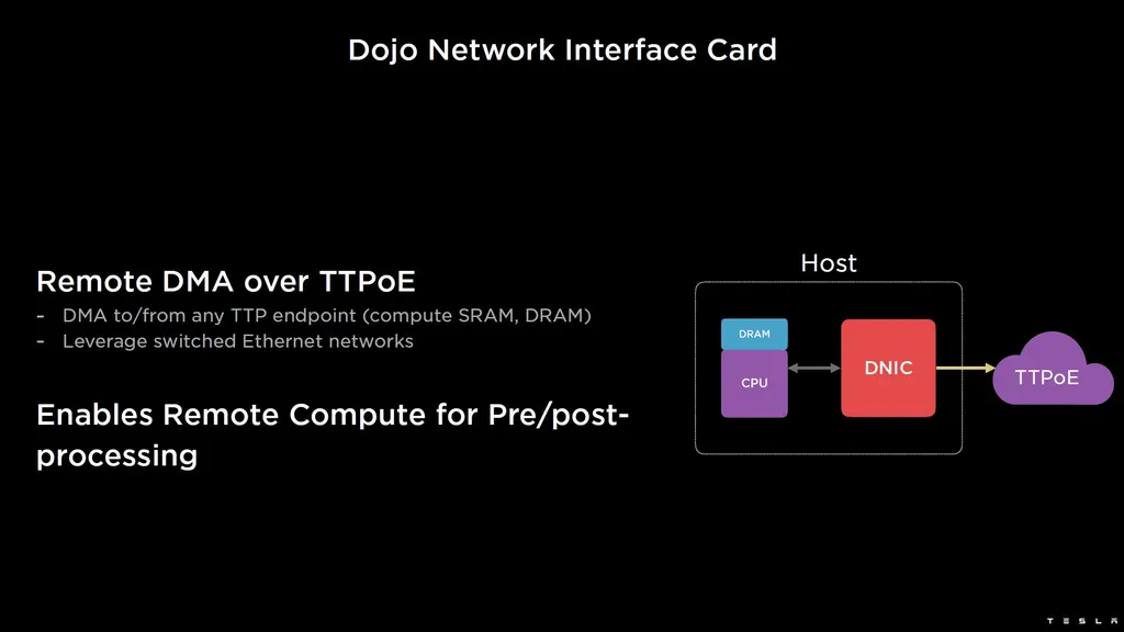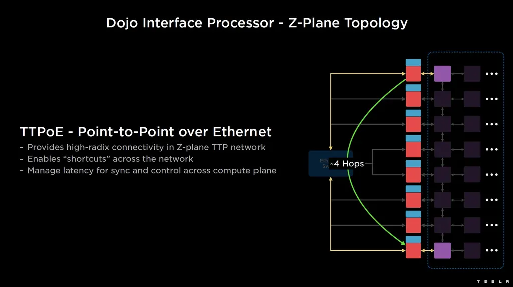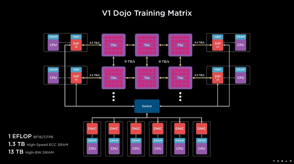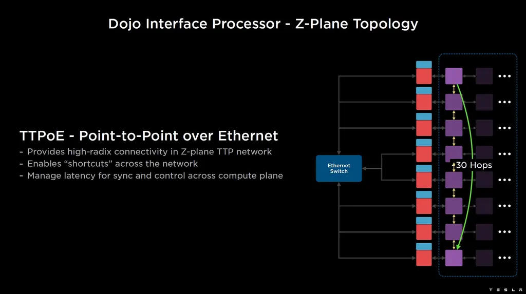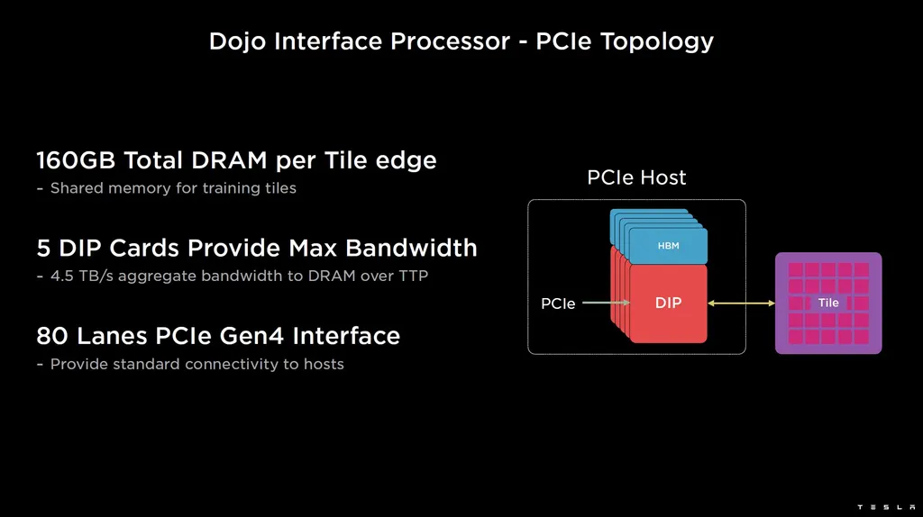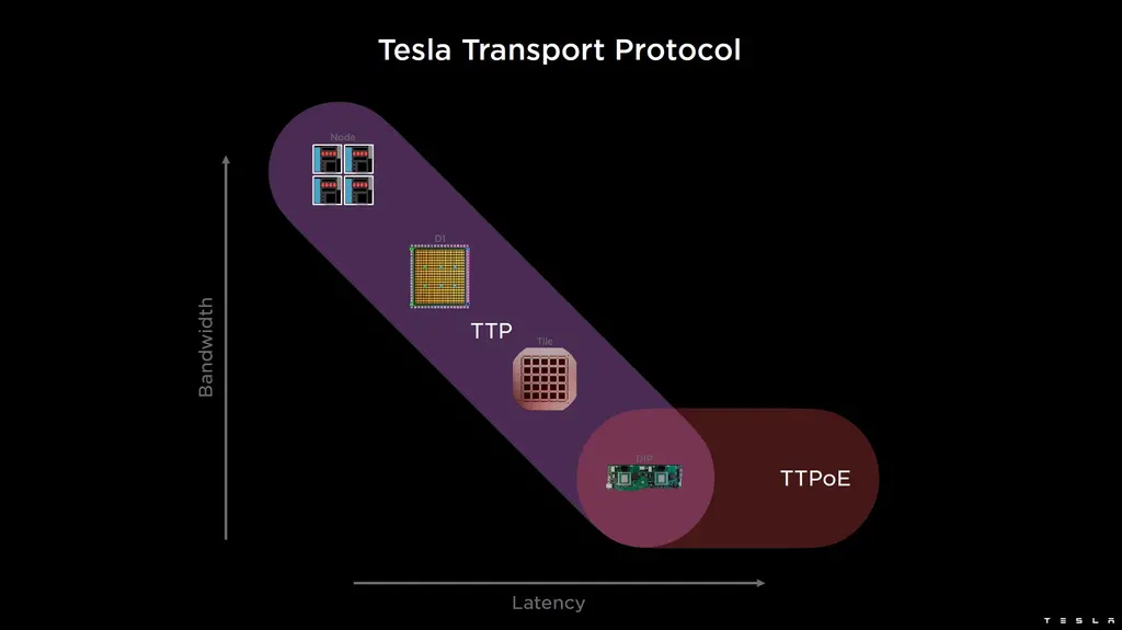 Tesla 特斯拉使用内部 Tesla 传输协议 (TTP) 接口,提供极高的带宽。 Tesla 传输协议还通过随附的软件使用以太网来定位整个 Tesla 系统的一致地址空间或桥接到接口卡。特斯拉 Dojo 定制 AI 超级计算机配备多达五张使用 PCIe 主机服务器的卡,并在每个训练块上提供 4.5TB/s 的带宽。