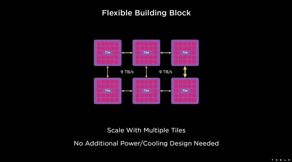 Dojo 最重要的技术进步是它的 System-On-Wafer 解决方案。每 25 个内核(dies)搭配 1 个 15 千瓦的集成 D1 内核。除了 25 个 D1 内核外,Tesla 还集成了 40 个更小的 I/O 内核。特斯拉 Dojo 的散热和电源总成都整合到培训 tile 上。这些 tile 在链接总数为 9TB/s 的其他 tiles 之间进行缩放,并且必须附加而不是依赖于服务器。