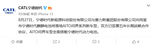 8月27日消息,据第一财经报道,宁德时代麒麟电池第一批落地品牌确认,为问界与极氪。宁德时代官方发布消息称:8月27日,宁德时代新能源科技股份有限公司与赛力斯集团股份有限公司共同宣布宁德时代麒麟电池将落地AITO问界系列新车型,双方已签署五年长期战略合作协议,AITO问界车型全面搭载宁德时代动力电池。(目前该条微博已被删除,疑似偷跑)