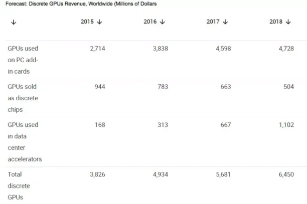 据Gartner统计,PC端GPU从2015年的27亿美元增加到47亿美元,几乎增长了一倍,GPU总营收也从38.2亿美元猛涨至64.5亿美元。
