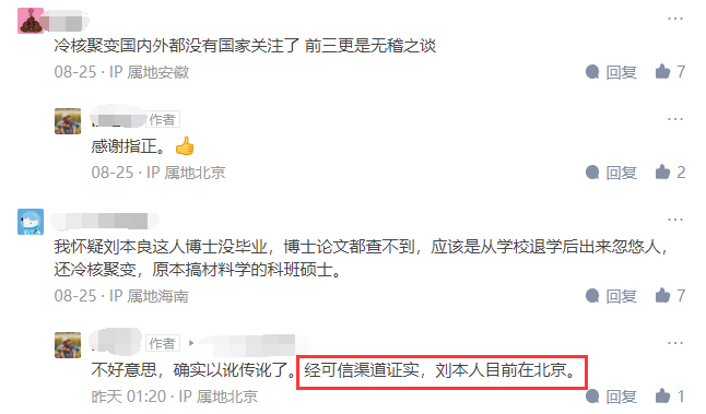知乎有网友表示,刘本良本人就在北京,并非某些自媒体所说的美国。刘本良在美国核聚变研究所拿着1.2亿的年薪,纯属无稽之谈。