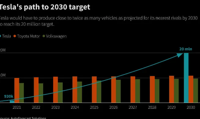 马斯克为特斯拉制定了一个在2030年销售2000万辆电动汽车的大胆目标,这是该公司对股东许下的增长承诺以及推动可持续能源普及誓言的重中之重。如果能实现这一目标,特斯拉的规模将达到历史上产量最高汽车制造商的两倍,拿下全球汽车市场的大约20%。