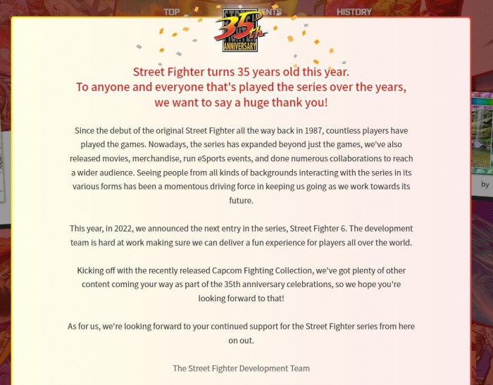 8月30日是《街头霸王》系列35周年的纪念日,卡普空准备了一个充满插图的纪念网站,该网站收录了《街头霸王》系列的历史,以及来自开发团队的问候。他们表示,最近推出的《卡普空对战格斗合集》是35周年纪念的一部分,未来还将会有更多内容推出,敬请期待。