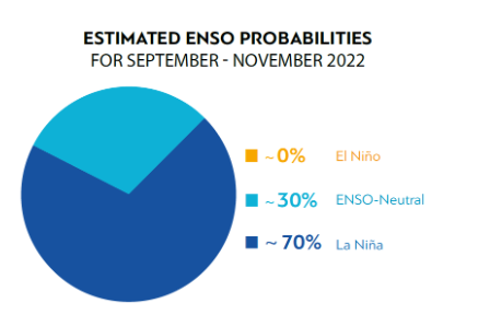 世界气象组织预测,今年9月至11月,拉尼娜现象有70%的机会持续存在。从2022年12月到明年2月,它有55%的机会持续存在。