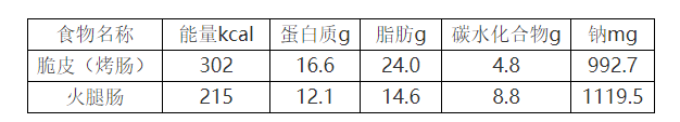 火腿肠、脆皮(烤)肠食物营养成分表,图片来源:杨月欣,《中国食物成分表2004第二册》03自己买烤肠如何进行挑选?