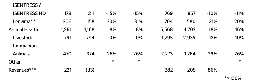 2021年默沙东主要药品以及动物保健产品的销售情况。