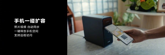华为家庭存储首次接入网络后,通过手机(需支持NFC)碰一下存储前面的NFC区域,在手机桌面上立刻出现快捷弹窗,连接后实现一碰扩容。