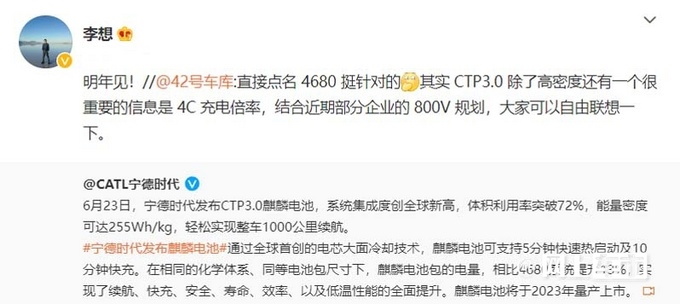 关于该车的消息,理想汽车没有透露太多信息,不过此前宁德时代在发布第三代CTP——麒麟电池时,理想汽车CEO 李想曾转发过相关评论,并给出“明年见”的回应。