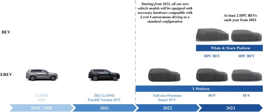 这次理想ONE停产事件的导火索,官方号称理想ONE换代车型的理想L8,产品进度也大幅度的提前。根据理想汽车2021年在港交所上市时递交的文件显示,理想将在2022年推出增程式全尺寸豪华智能SUV,并在2023年推出另外两款增程式SUV,从2023年起,每年至少推出两款纯电车型。