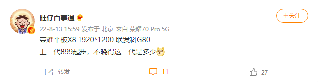 此外,还有荣耀平板X8,数码博主“旺仔百事通”透露,荣耀平板X8将采用一块1920*1200分辨率的屏幕,搭载联发科G80芯片。