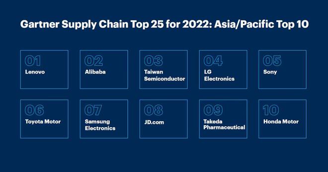 9月8日消息,数据研究机构Gartner日前公布了2022年亚太区供应链10强榜单排名,其中,联想集团成为排名最高的企业,阿里排名第二,台积电排名第三。此外,上榜的企业还包括LG电子、索尼、三星电子和京东等公司。