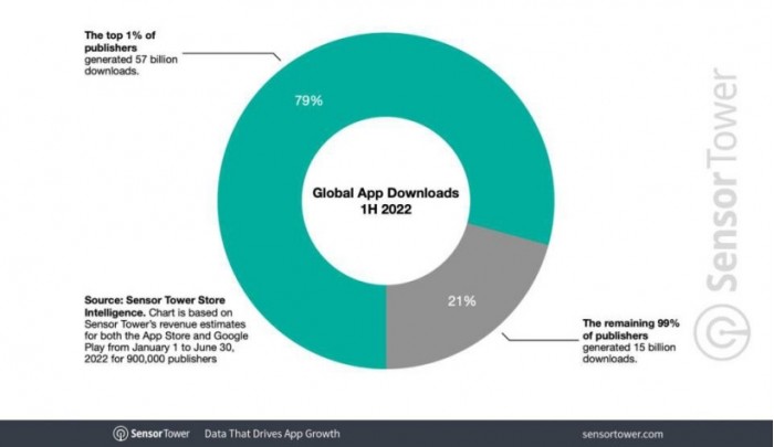 今天数据调查机构SensorTower发布了2022年上半年的App营收报告,展示了1-6月AppStore和Google Play中,应用的营收情况。根据分析结果,有1%的开发商共计获得了79%(720亿次)的下载安装,其他99%的开发商则在竞争剩下21%的市场。