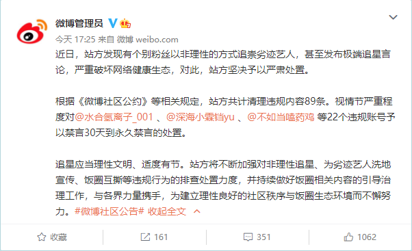 微博将与各界力量携手,为建立理性良好的社区秩序与饭圈生态环境而不懈努力。