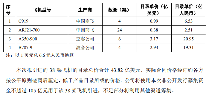 其中,C919首个客户东航去年已与中国商飞签署购机合同。之后,东航又在5月发布定增公告,拟募集资金总额不超过150亿元,其中105亿元将用于引进38架飞机项目,包括4架C919飞机。