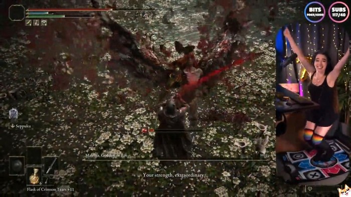 《艾尔登法环》女武神玛莲妮亚是最令玩家头疼的Boss之一。其动作快、攻击范围大,攻击还会吸血回血,导致许多人受苦。近日女主播MissMikkaa在推特上分享视频,展示了她使用跳舞毯击败女武神的画面。