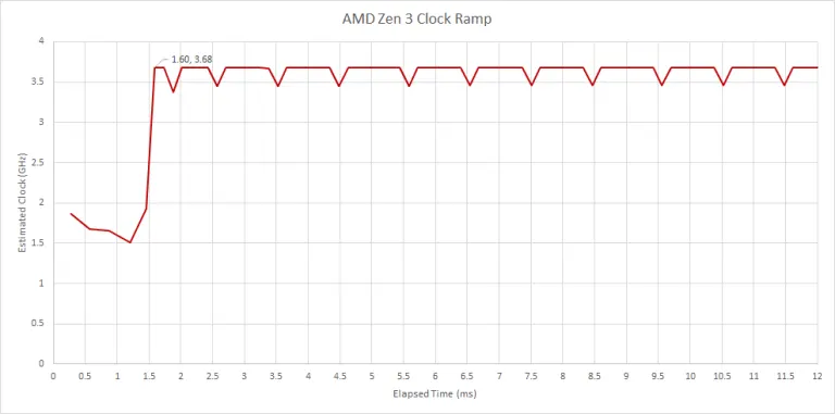 根据测试结果,一项有趣的发现是 Ryzen 7 5800U“Zen 3”移动处理器的时钟调整速度甚至比装备在手持设备中的移动芯片(例如高通的骁龙 821)更快,前者的变化时间为 1.6 毫秒,而后者的时间为 19.6 毫秒。