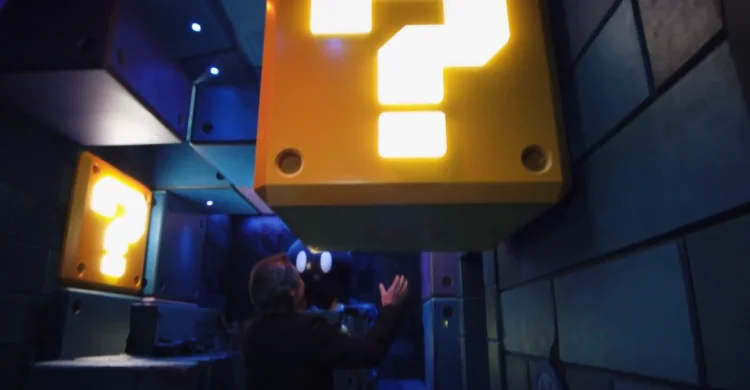 而在超任世界中,这样的砖块叫做 Block activity,也是人们在主题公园里游玩的重要元素。和在游戏里一样,砖块玩家可以用顶一下的方式和它们互动。