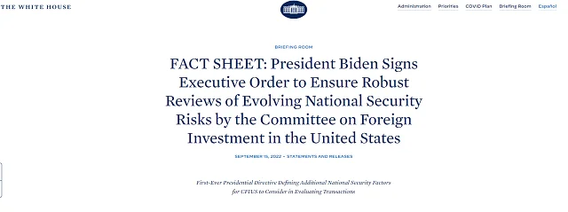 根据行政令,未来CFIUS加强审查的领域包括半导体、AI、生物技术、量子计算和先进清洁能源等。拜登政府发出了首个指示美国外国投资委员会(CFIUS)在评估交易时需考虑其他国家安全因素的总统行政令。