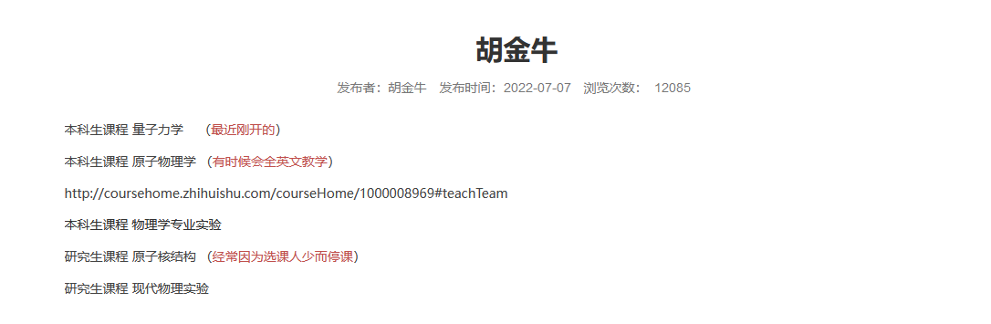 在教学经历方面,胡金牛也坦言研究生课程“原子核结构”经常因为选课人少而停课。