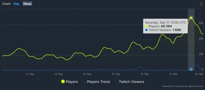 另外,受衍生动画《边缘跑者》的推动,《赛博朋克2077》录得近七万名玩家同时在线,创下自今年2月以来最高纪录: