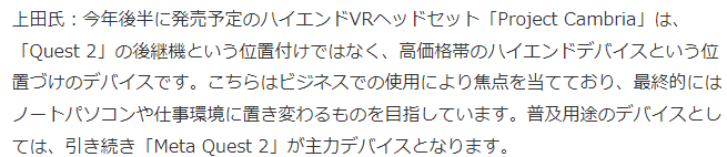 •Meta高管谈到“Project Cambria”的定位时表示,并非旗下主流VR头显Meta Quest的后继二代机型Meta Quest 2,而是一款价格较贵的定位高端配置款,目标用户群体为高端商务系,多应用于搭配高级笔记本使用的场景下,而Meta Quest 2今后推出,会继续延续主流产品路线。