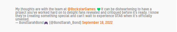之前我们曾报道了《GTA6》多段实机演示泄露:男女主角造型亮相,而就在近日,XBOX公司副总裁萨拉·邦德在推特上表示与游戏开发团队团结一致,说她很同情在R星游戏还没准备好之前就被人“展示”出来的感觉。