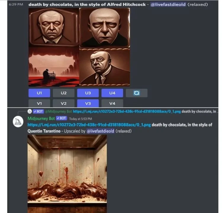 此外,当你在关键词中输入不同的画家、作家、导演的名字时,输出的图片风格也会因此而改变。比如在硅星人所在的这个新手村中,就有一位朋友乐此不疲地结合大卫林奇、希区柯克、昆汀等风格玩着“Death by Chocolate”的创作。