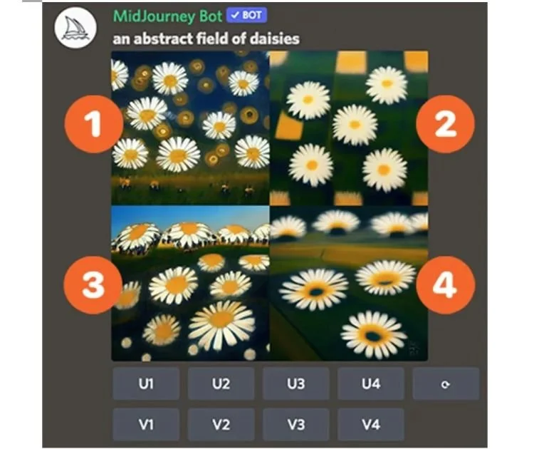 图片下方的字母U 代表选择一张放大细化, V 代表在这张图基础上进行变化。如果这四张图没有你满意,你还可以点击右侧刷新按钮重新生成新的四张图片。当你选择了一张图片之后,还可以继续细化,比如变形、放大尺寸、细节优化等。