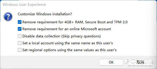 步骤五:在弹出的Windows 自定义安装里选择第一及第二项(也就是去除硬件要求以及去除安装时微软账户登录)。