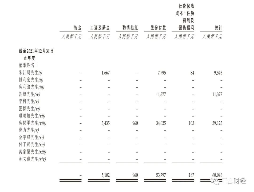 2021年,朱江明总薪酬为954.6万元,其中年薪为166.7万元,股份付款为779.5万元;2020年,朱江明的薪酬为4648.9万元,全部为股份付款。