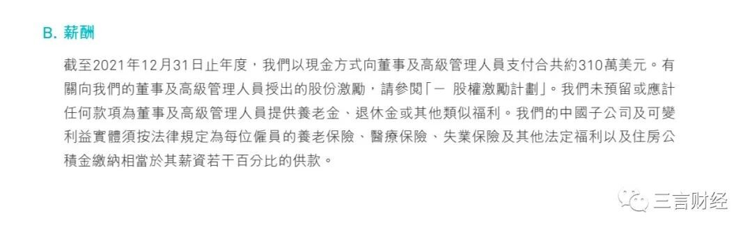 蔚来方面,蔚来汽车并未在财报中公布高管薪资,仅表示截至2021年12月31日,蔚来以现金方式向董事及高级管理人员支付合共约310万美元。