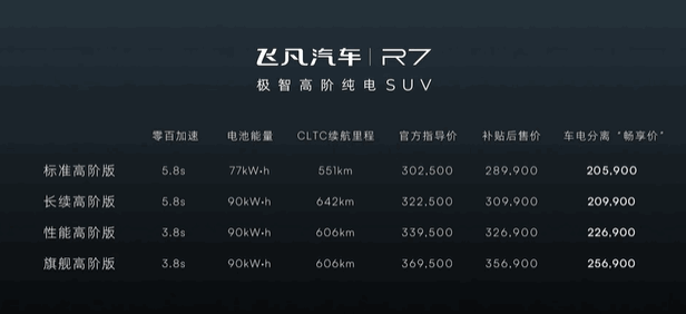 9月27日晚间,飞凡R7正式上市,新车共推出4款车型,补贴后售价区间为28.99-35.69万元;此外,用户还可使用“车电分离”购买模式,不买电池,购车价除入门版外,直减10万元;而入门标准版车型,车电分离价格为20.59万元。